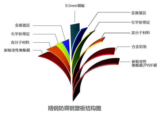 精鋼防腐鋼塑板運用全新的理念和工藝技術,以高強度特種鋼板為基板,層壓復合高反射鏡面鋁箔、抗老化改性聚酯薄膜等材料,實現了同時集高效隔熱和長壽命于一身。
