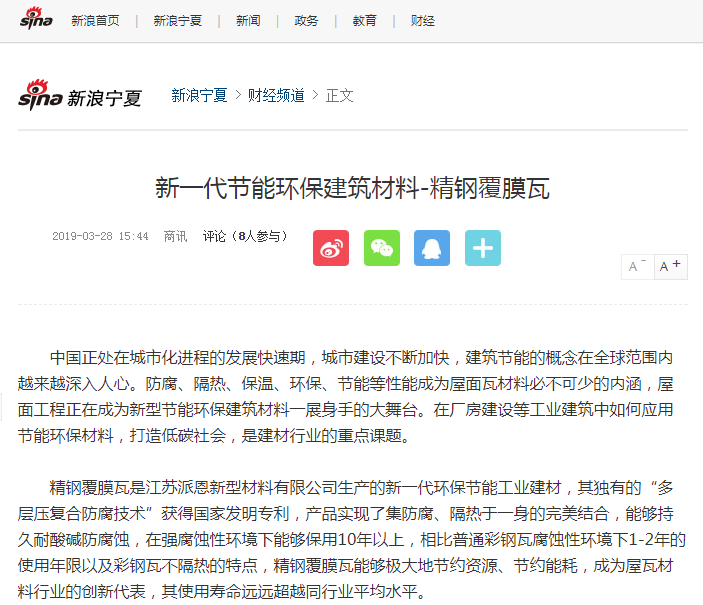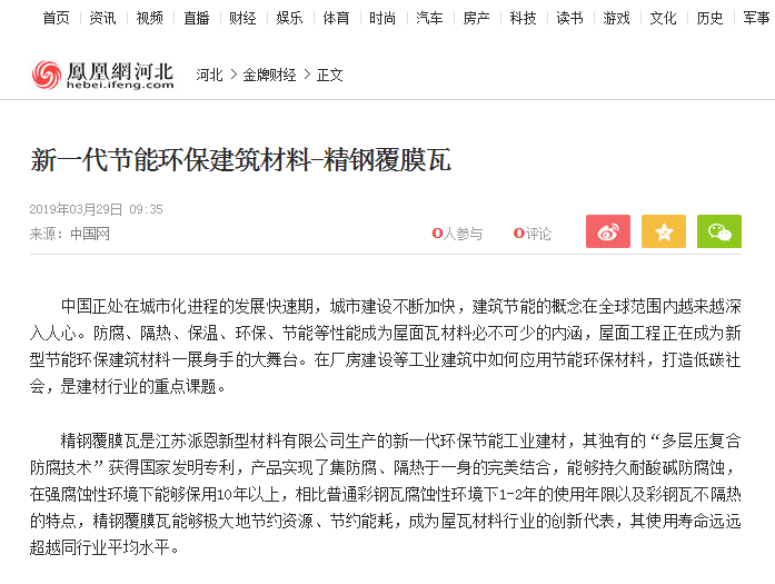 近日,中華網、鳳凰網、新浪網等數十家媒體就派恩公司自主研發生產的新一代節能環保建筑材料——精鋼覆膜瓦產品予以廣泛報道,引發社會強烈反響。 精鋼覆膜瓦是江蘇派恩新型材料有限公司旗下產品,是一種新型覆膜金屬瓦,是新一代廠房屋面、墻體建筑材料,是彩鋼瓦的升級換代產品,具有突出的防腐和隔熱2大功能,腐蝕性環境下保用10年以上!